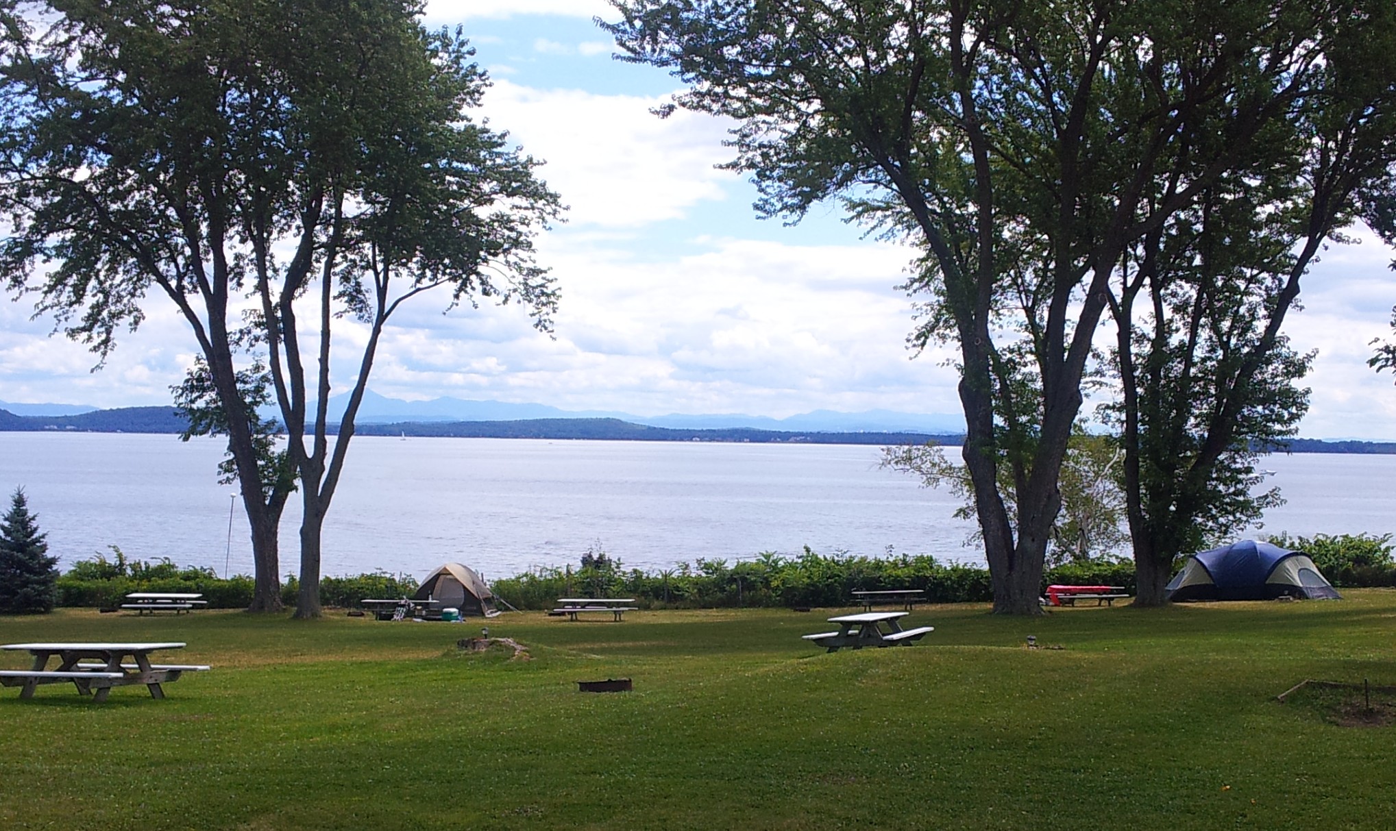 We have 14 rustic (no hookup) campsites located on 6 acres of lakeshore property with beautiful lake views. Each grassy site has a campfire ring and a picnic table with views of Lake Champlain. The sites are open in nature with a few large shade trees in the tenting area. Although we do not offer any secluded camping sites, our relaxed atmosphere has nurtured numerous friendships between families over the past 95 years.
